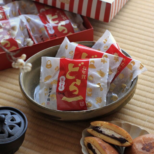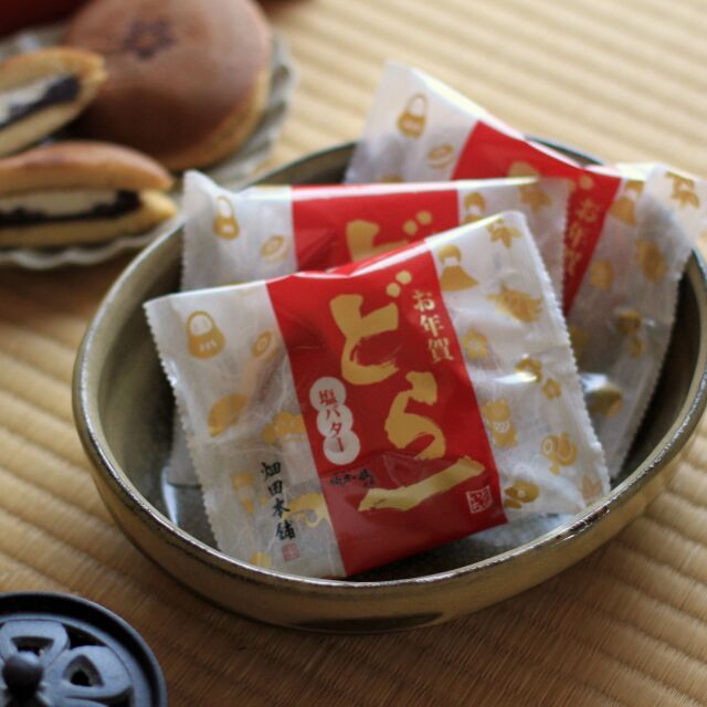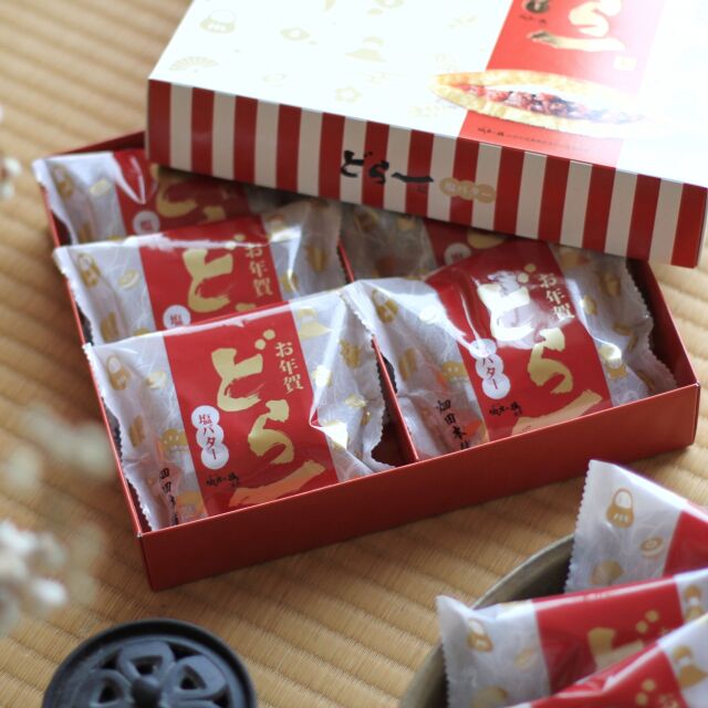 縁起物を散りばめた、お正月限定のめでたいお年賀パッケージのどら一(塩バター6個入)が登場!